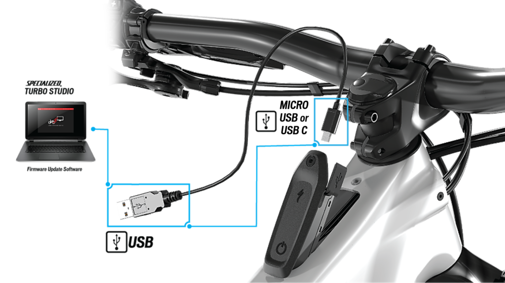 Aktualizace po kabelu lze provádět pouze u autorizovaných prodejců Specialized Turbo, a to propojením kola s PC s Windows, za použití Turbo Studia. Průvodce `How to connect & update` je dostupný na úvodní stránce Turbo Studia a demonstruje jak připojit jakékoliv elektrokolo Turbo se středovým motorem.